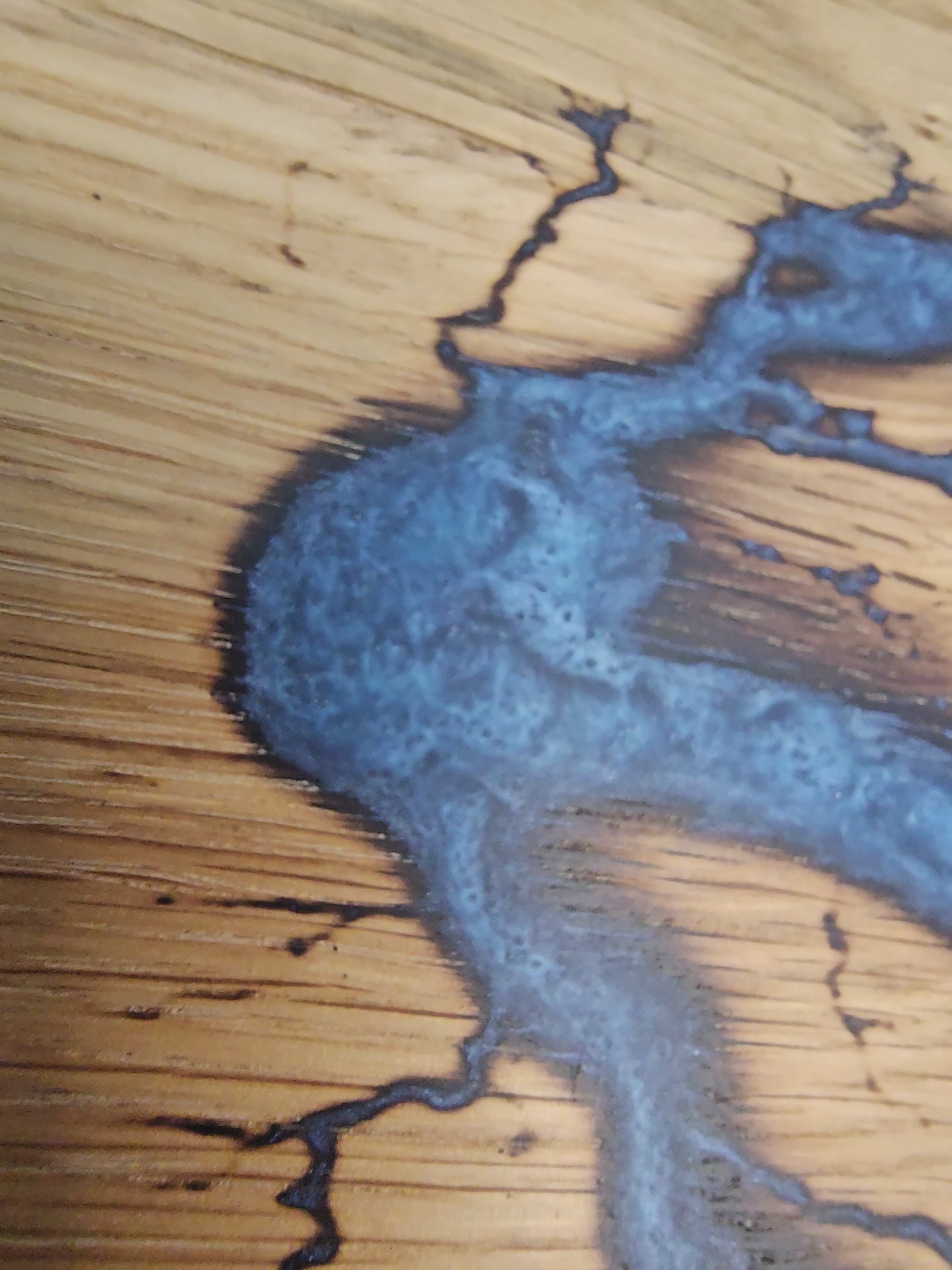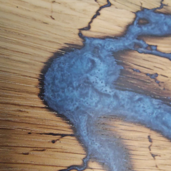 Bring the beauty of nature and craftsmanship into your kitchen with this handcrafted oak slab. Measuring 445mm x 250mm x 38mm, this premium board is both practical and artistic. Made from solid oak, it features fractal-burned patterns that are filled with a striking blue resin inlay, creating the look of rivers flowing across the grain. No two boards are ever identical, making this a truly unique piece.